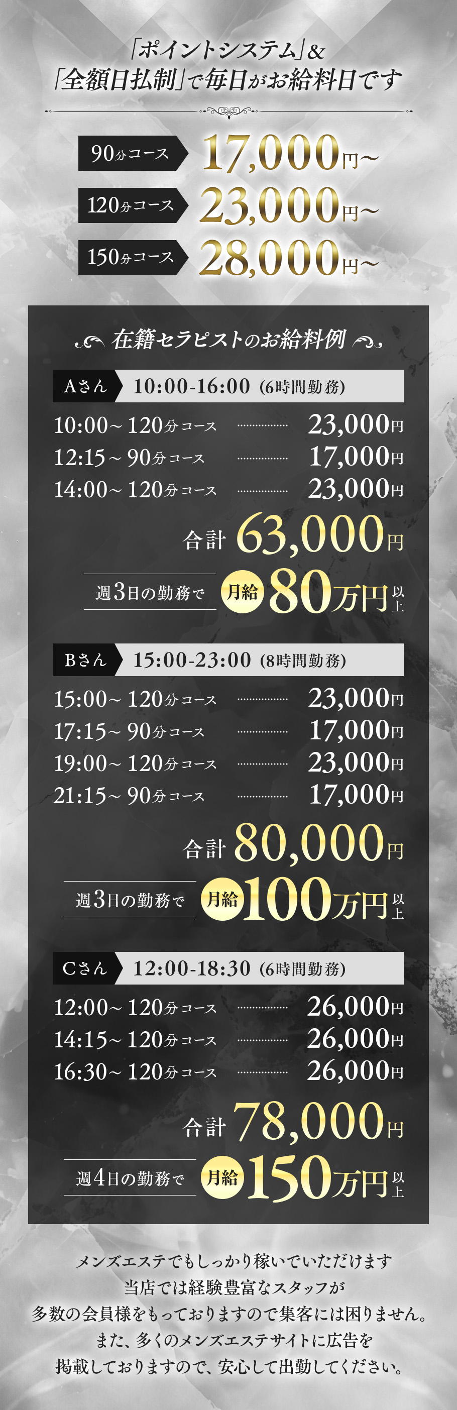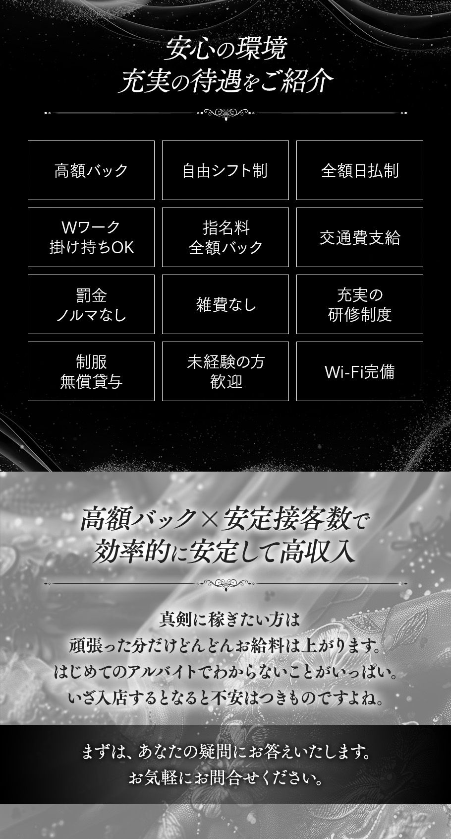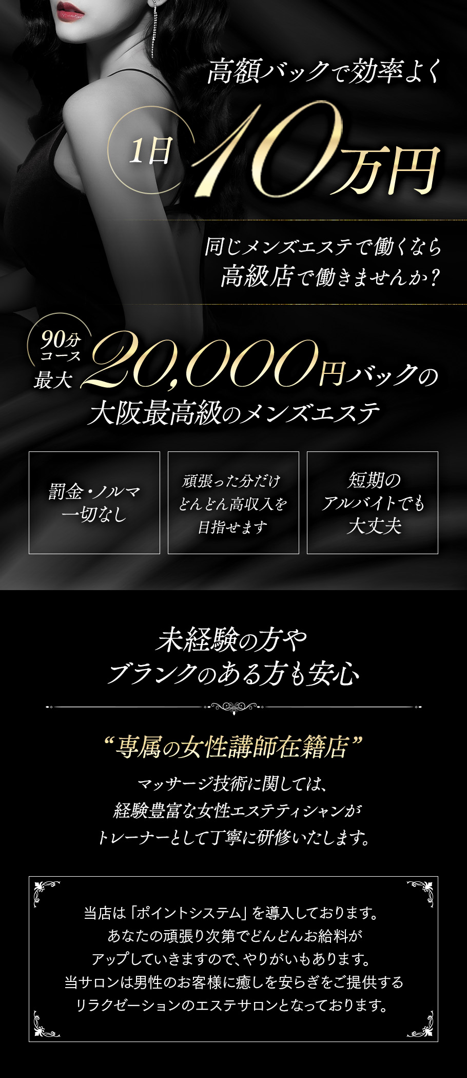 お店情報 店 名 Aurora(アウローラ)] 業 種 メンズエステ 勤務地 京橋・谷九・新大阪・堺筋本町 勤務時間 10:00~翌朝5:00の間でお好きな時間を選択してください 応募資格 18歳(高校生不可) 給 与 日給35,000円以上 お名前* ご年齢* 歳 お電話番号* メールアドレス* 備考
